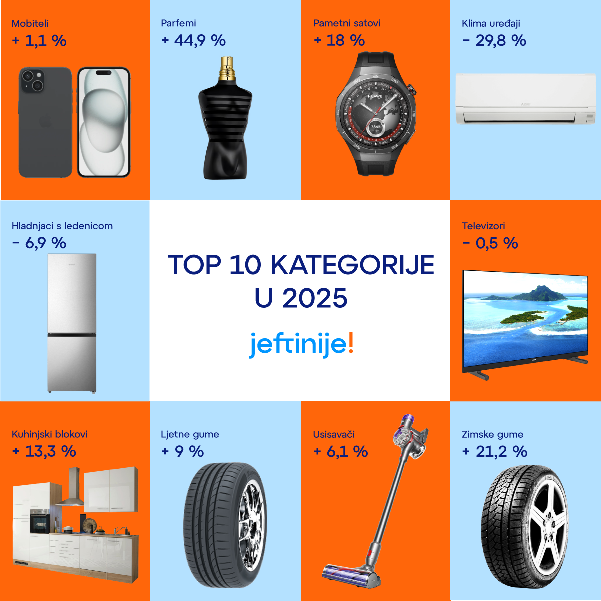 Podaci platforme Jeftinije.hr, vodeće hrvatske platforme za usporedbu cijena, pokazuju da je 2025. glavna kategorija Home & Garden bila najistaknutija, s podkategorijama poput Mobitela, Parfema, Pametnih satova, Klima uređaja, Hladnjaka s ledenicom, Televizora, Kuhinjskih blokova, Ljetnih guma, Usisavača i Zimskih guma među top 10. A godišnji podaci iz top 100 pretraga otkrivaju hrvatske potrošače usmjerene prema mobilnoj tehnologiji, gospodinjskim rješenjima, sezonskim potrebama i životnom stilu. (Vir: Jeftinije.hr)