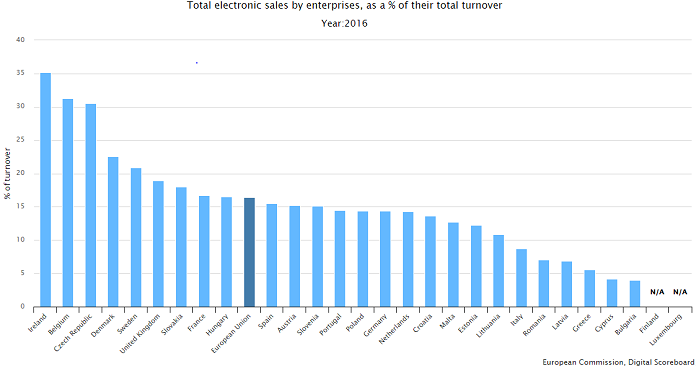 Istraživanje Digital Scoreboard u izvedbi Europske komisije omogućuje uvid u promet prodaje od interneta s obzirom na cjelokupan promet pojedinih poduzeća. U 2016. prosjek za Hrvatsku je iznosio 13,6 %.