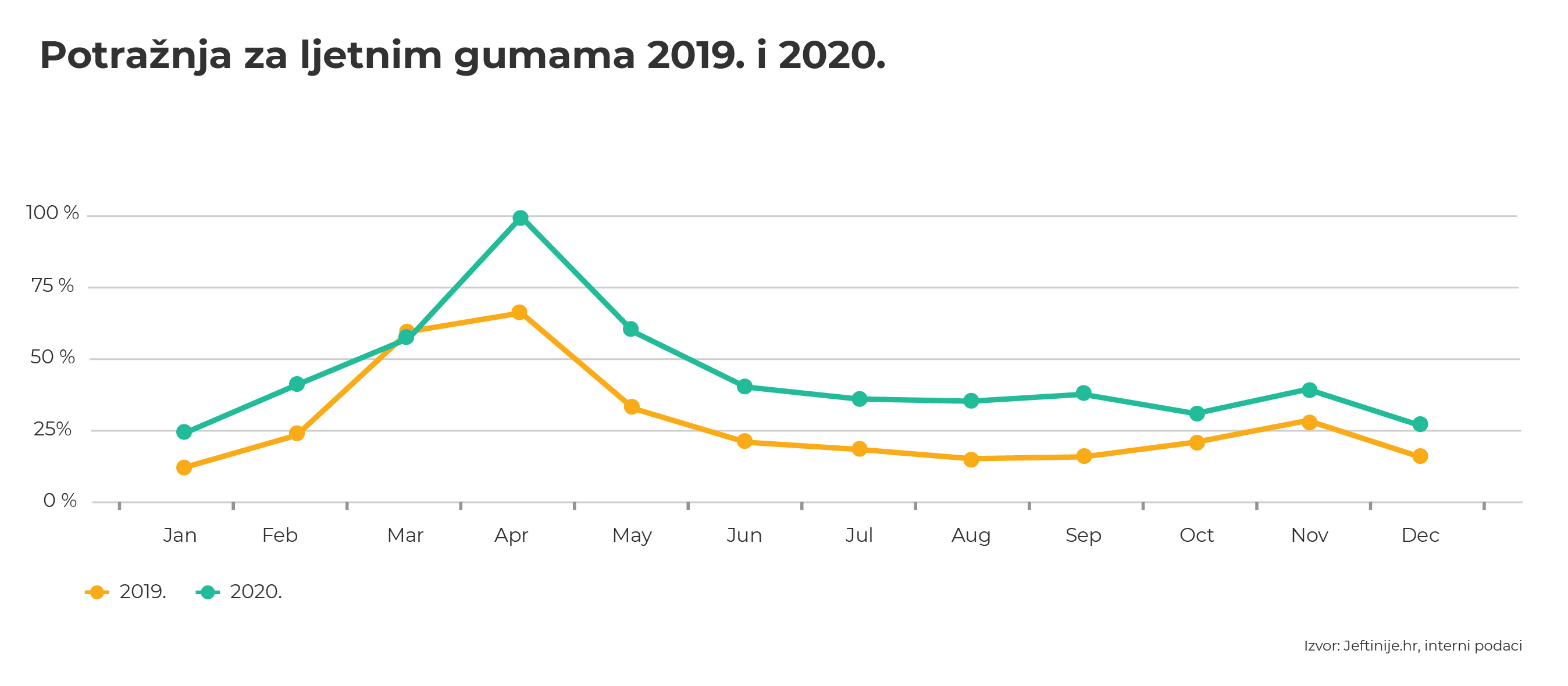 Već krajem siječnja u Hrvatskoj počinje u porast potražnje za ljetnim gumama i nastavlja se u veljači. Kupci tada počinju ubrzano istraživati ponudu, a vrhunac zanimanja primjećujemo u travnju. Zanimanje za kupnju ostaje vrlo visoko kroz čak četiri mjeseca, a pad primjećujemo tek u lipnju.