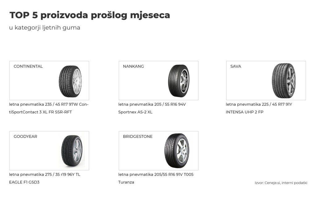 Među pojedinačnim proizvodima u kategoriji ljetnih guma, na sam vrh popularnosti našla se guma: GOODYEAR Wrangler AT ADVENTURE XL 225/70 R16 107T Ofroad. Slijedile su je gume: HANKOOK 205 / 55 R16 91V K115 i PIRELLI Cinturato P7 215/55 R17 94V. U Sloveniji, najpopularniji modeli bili su: CONTINENTAL 235 /45 R17 ContiSportContact 3 XL FR SSR-RFT, NANKANG 205 /55 R16 94V Sportnex AS-2 XL i SAVA 225 /45 R17 91Y INTENSA UHP 2 FP.