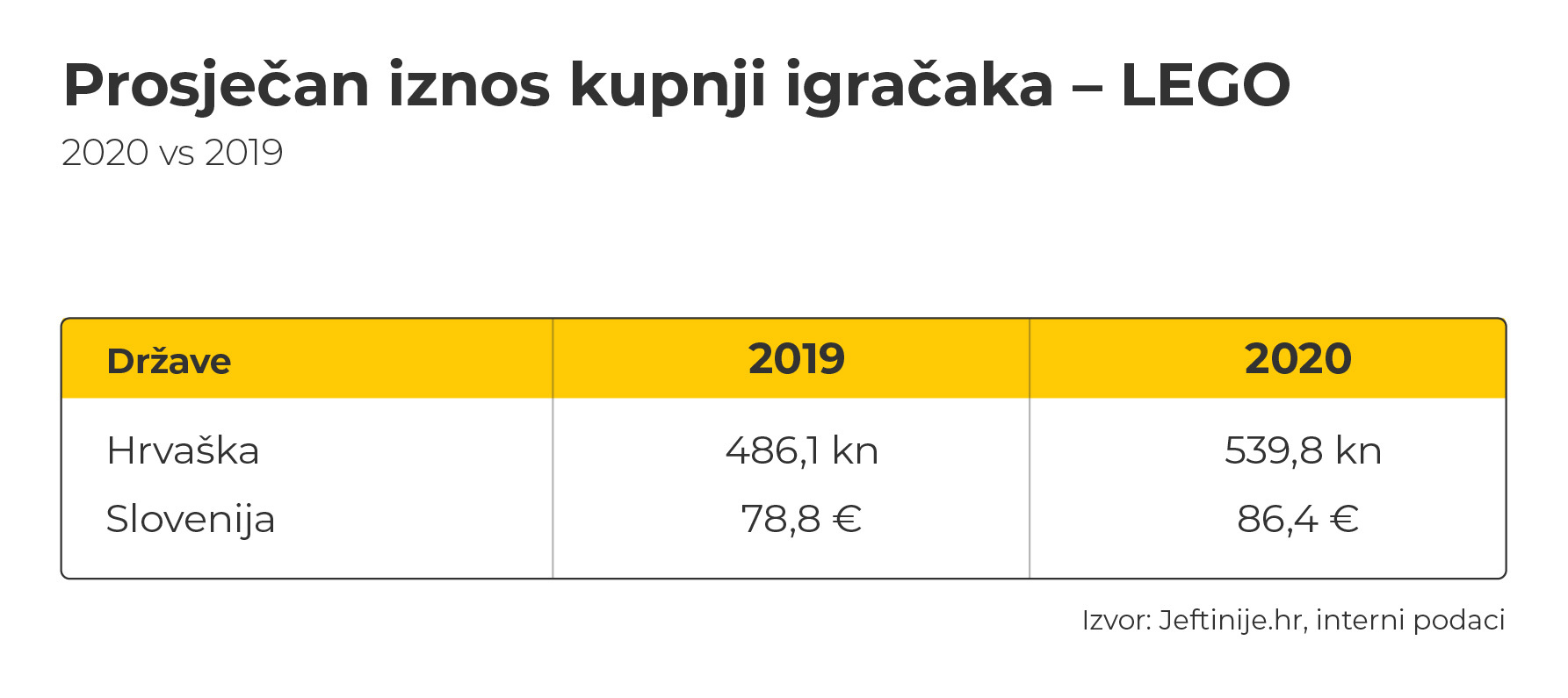 Uz porast potražnje, moguće je primijetiti i porast prosječnog iznosa kojeg su potrošači spremni potrošiti na set Lego kockica. To se može objasniti relativno višim iznosom košarice, ali istovremeno to možemo pripisati i dugoročnom trendu kojeg očekujemo s obzirom na podatke. U Hrvatskoj se košarica pri kupnji omiljenih kockica povisila s 486,10 kn na 539,80 kn dok je u Sloveniji porasla s 78,80 € na 86,40 €.