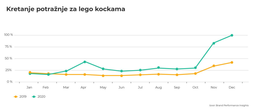 U posljednjih pet godina LEGO je zabilježio najveći rast prodaje proizvoda upravo u 2020. godini snažno obilježenoj ograničenjima i epidemijskim mjerama. Porast potražnje za kultnim kockicama pripisuje se povećanom vremenu provedenom kod kuće gdje su djeca kao i roditelji tražili različite načine za zabavu i korisno provođenje vremena. A u kojem se točno trenutku povećalo zanimanje za LEGO kockama? Jesu li se promijenile navike kupaca u kategoriji igračaka i kako to možemo vidjeti?